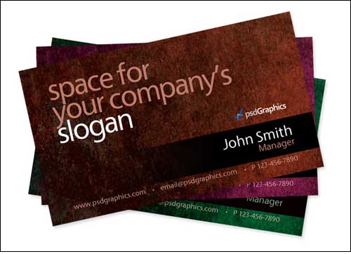 Business card Photoshop template with a nice grunge texture in the background. Background color is available in brown, purple and green colors, to change the color turn on/off the hue/saturation layer in the layers palette in Photoshop.