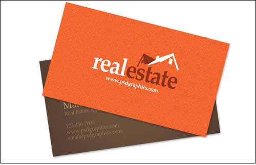 Real estate business card template in brown and orange colors, download an editable PSD source and edit in Photoshop. Print ready template with a simple real estate logo design.